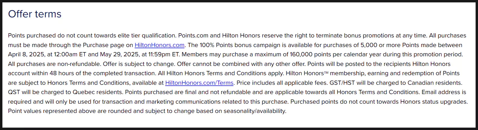 - Hilton Points can only be purchased through the official Hilton website, and purchases through third parties or third-party channels are not supported.