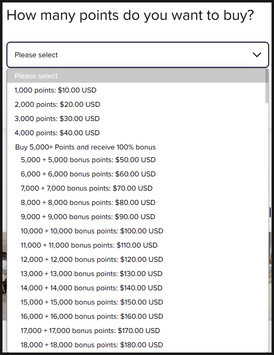 - Buy 10,000 points → get a bonus 10,000 points (20,000 points total)