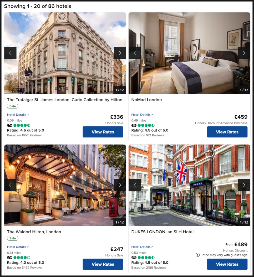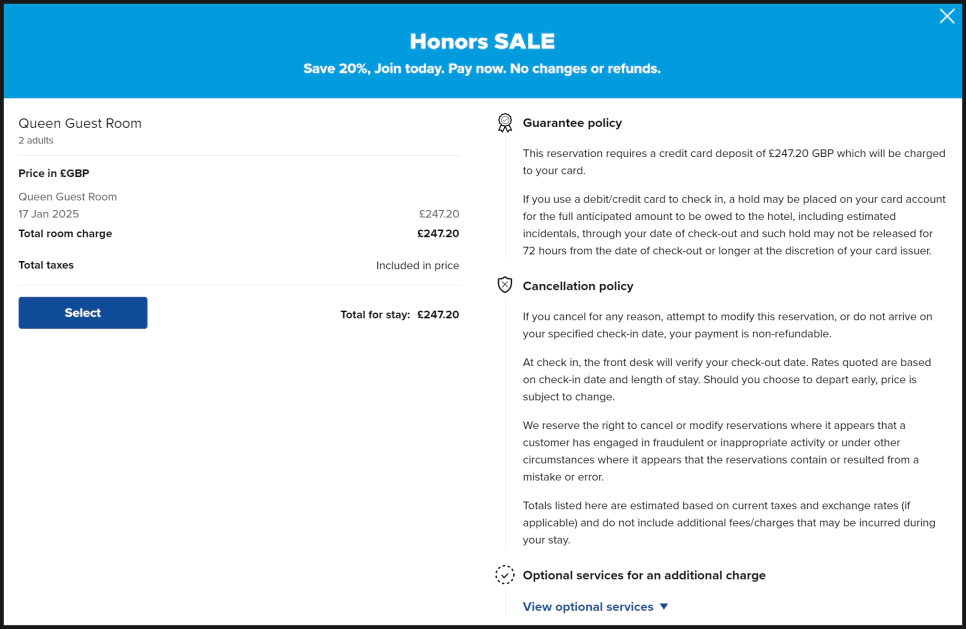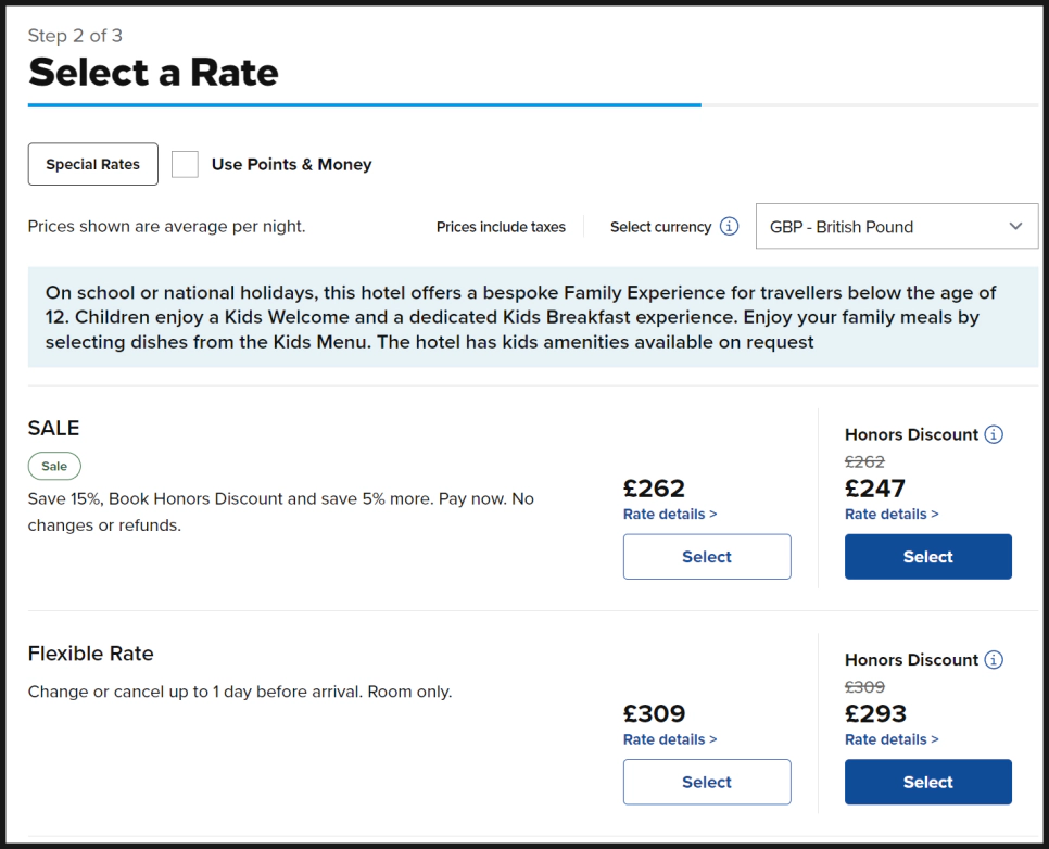 For example, a Friday night stay at The Waldorf Hilton, London is listed at £247 under the promotional rate, compared to the standard £309. These discounted rates are labeled “SALE” and are non-cancellable, so book with confidence only if your plans are firm.