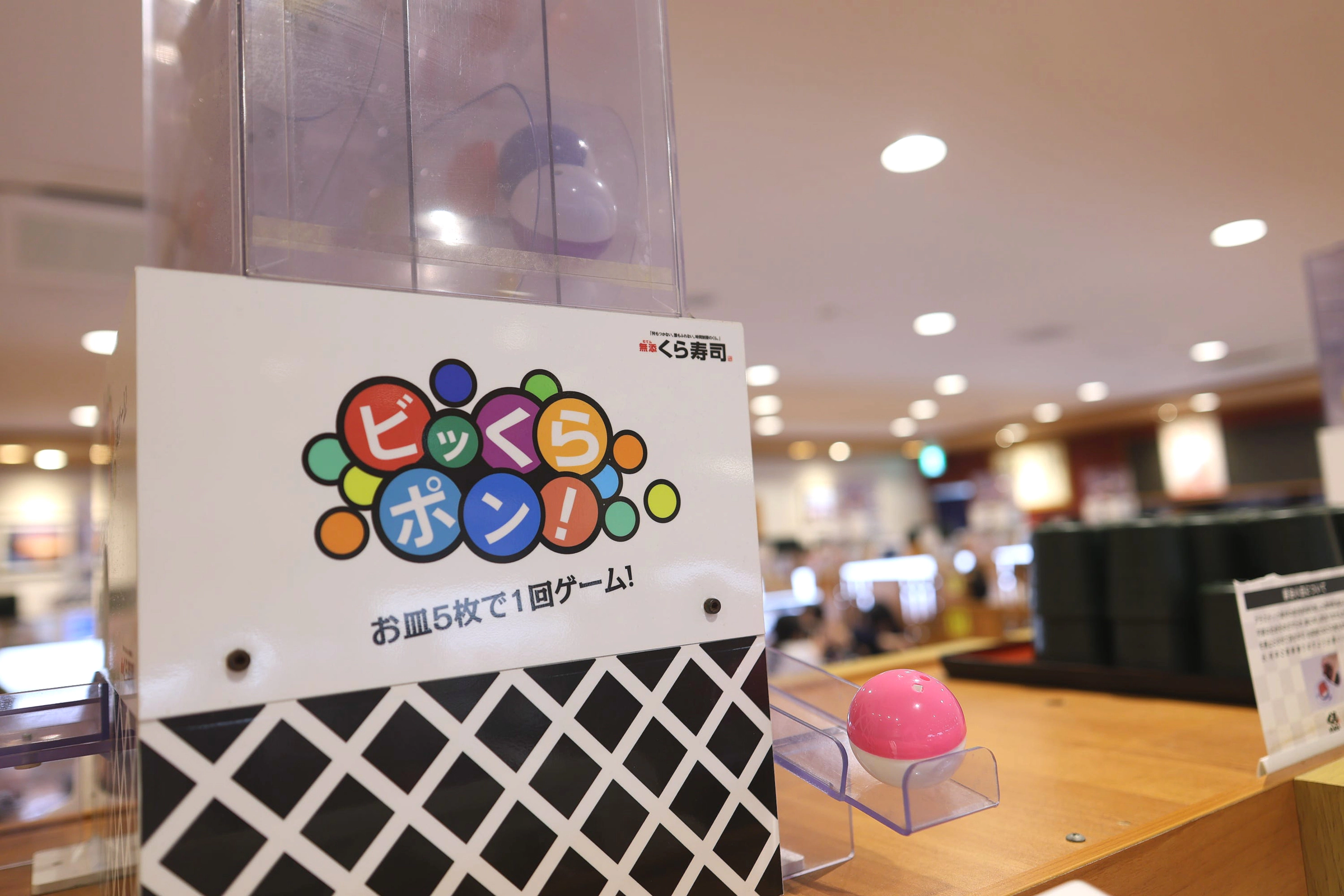 くら寿司のもう一つの楽しみとして、食べ終わったお皿を返却口に入れると、お皿を5枚入れるたびにタブレットで自動的にゲームが再生され、当たるかどうかが出てきます。 当たるとガチャマシンと同じように賞品が1つもらえますが、通常提携しているアニメキャラクターの賞品を贈呈します。