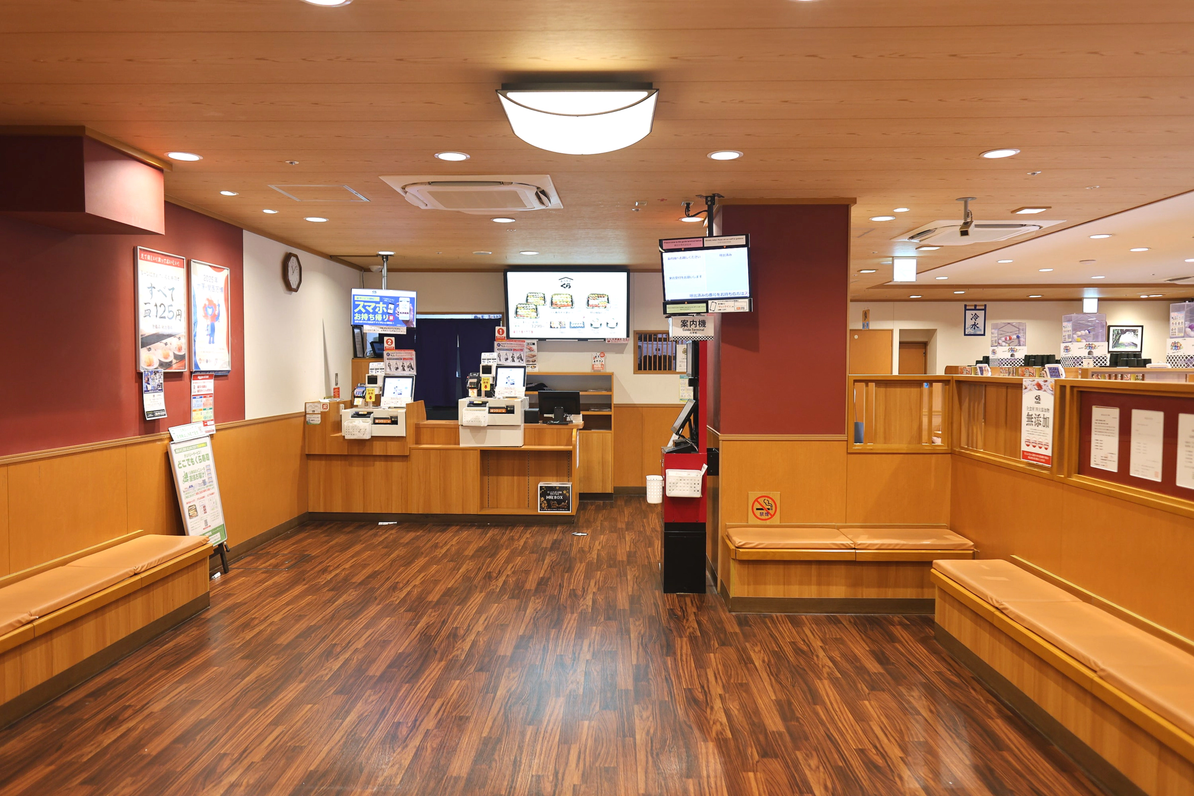 注文はタッチパネルから行い、通常の回転レーンの上にある専用レーンで寿司が席まで運ばれます。混雑している時は提供に時間がかかることがあるため、早めに注文しておくとスムーズに食事が進みます。