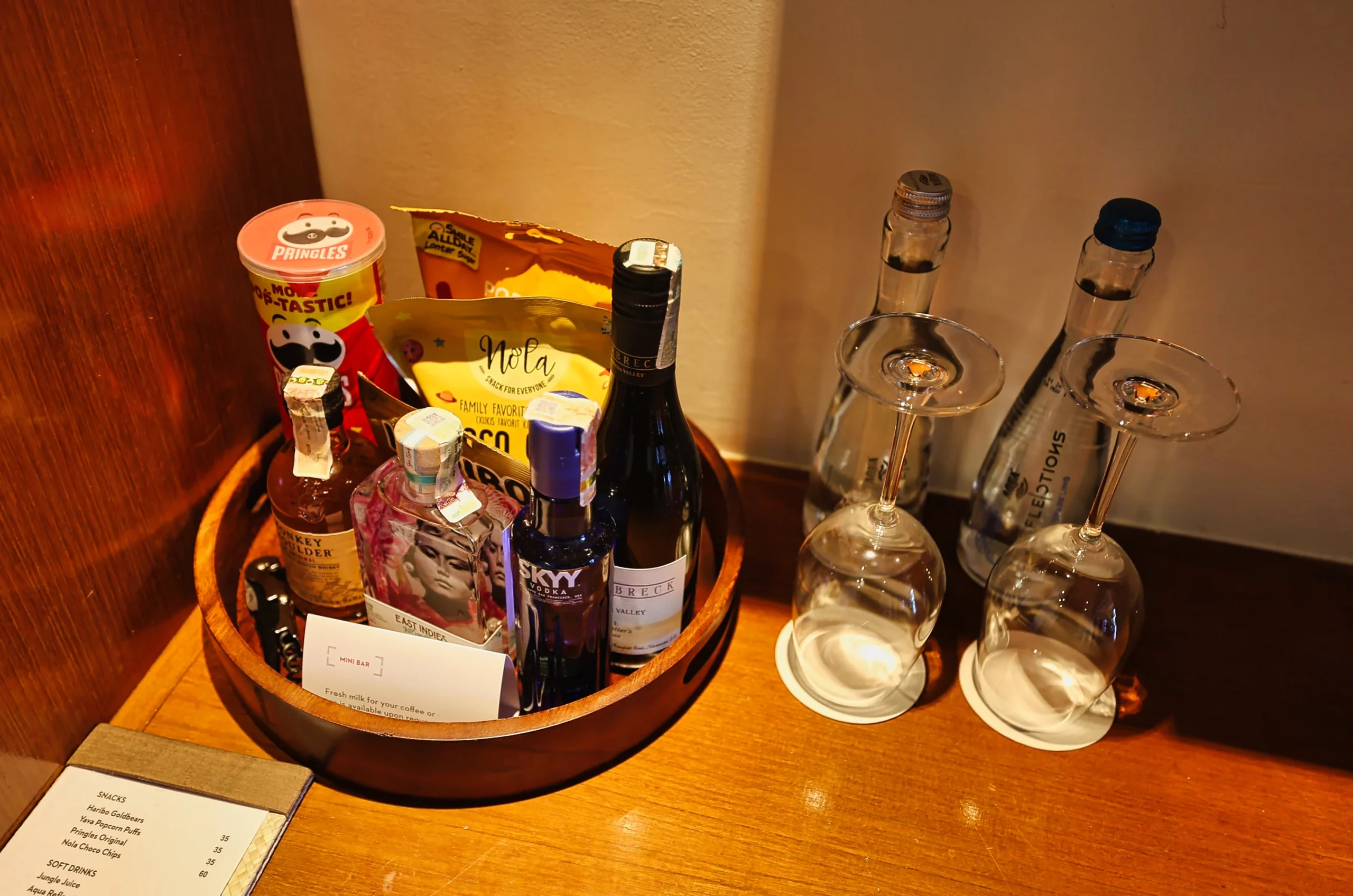 The suite came with several nice touches, including plenty of complimentary bottled water, a welcome plate of cookies and fruit, and a vase of fresh flowers on the desk that brightened the room. The minibar was stocked with drinks and snacks, which were available for an additional charge.