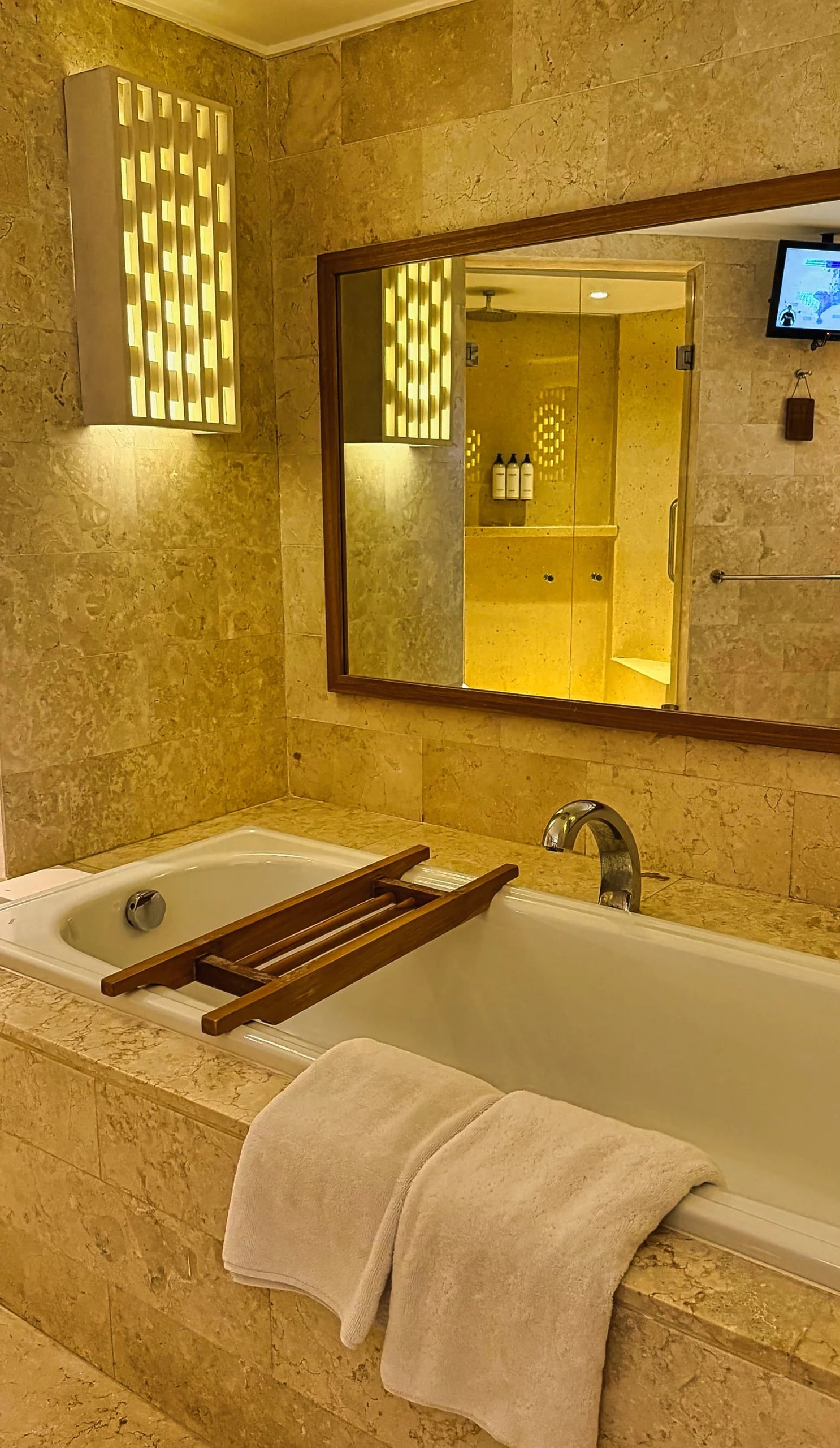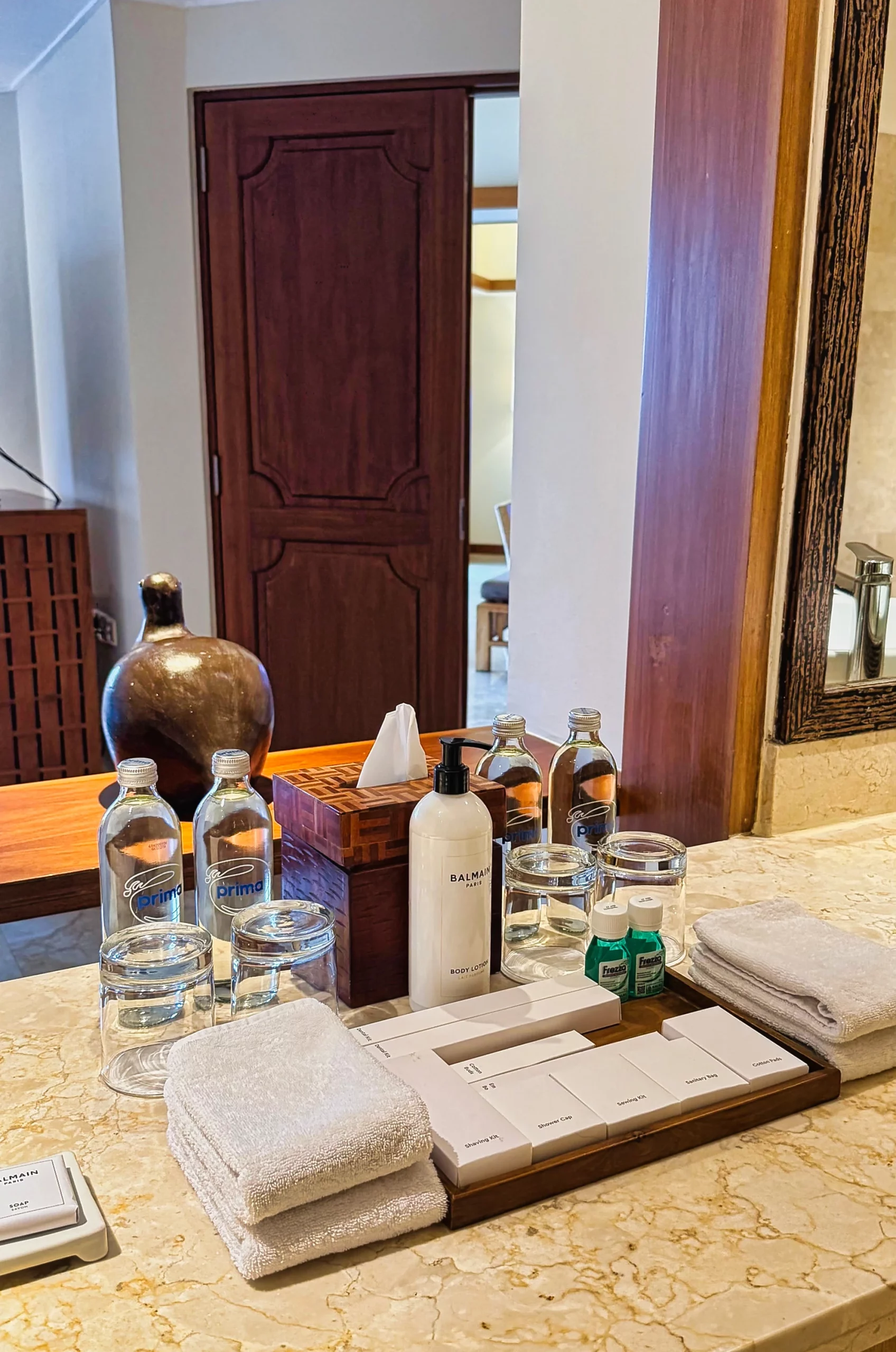 Consistent with the rest of the suite, the bathroom was exceptionally large. It featured a separate glass-enclosed shower, a deep soaking tub, and a long counter with dual sinks, which is always a welcome convenience. The hotel provided a comprehensive set of amenities, including water bottles, mouthwash, toothbrushes, and razors, so you hardly need to pack your own. The toiletries were from the French fashion house BALMAIN, which added a touch of luxury.